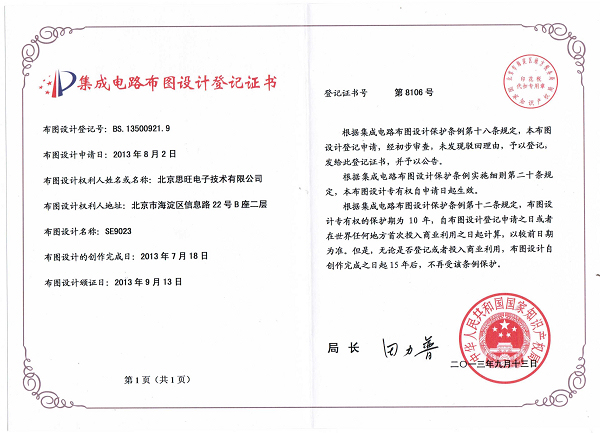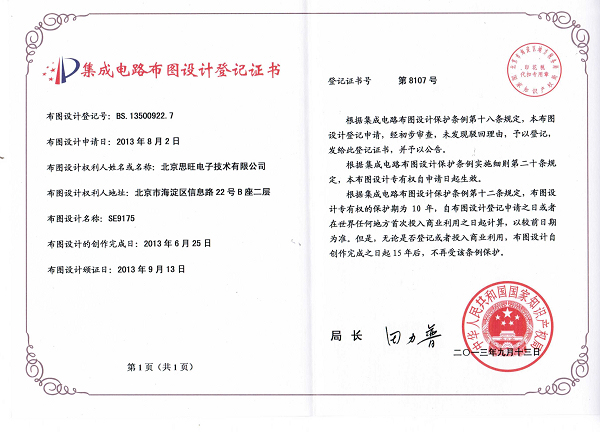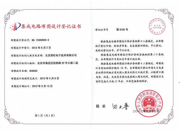 熱烈慶祝公司產(chǎn)品SE9022、SE9023、SE9175 完成國(guó)家知識(shí)產(chǎn)權(quán)局“集成電路布圖設(shè)計(jì)登記”